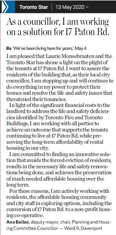 it is now summer 2020. 17 Paton Road is a group of 20 mostly artists who lost their homes, following an order to vacate our building by Toronto Chief Building because the building does not comply with the Ontario Fire Code. the March 10, 2020 evacuation order one of the letters of support we got shortly after this evacuation order, that nobody seemed to have the power to overturn, this despite the beginning of a global pandemic, should never have been released. we had already started to advocate for a long-term solution to keep our housing before the order and so, we tripled energy and continued with all sorts of amazing collaborations and at some point, we hoped that our landlords would accept to sell the building to the Parkdale Neighbourhood Land Trust (PNLT). the idea was that we would manage it as a co-op. our story in the Toronto Star at that moment (April 29, 2020). letter from artist and co-op founder Tanya Mars (May 9, 2020) letter to the Editor by our Councillor (May 13, 2020) after that, our hopes of a purchase grew even more as our Councillor mobilized significant public money and PNLT entered into closer conversation with our landlords, but that led nowhere and our landlords refused PNLT's offer. then, we mourned and the dignity breach that takes place when one looses home and a space to do their art manifested itself, but the task was to keep healthy while trying to find another place in the middle of a global pandemic crisis and affordable housing crisis, and while still continuing our advocacy work, but now shifting to a legal phase to claim our rights at the Landlord and Tenant Board (LTB). we will all be out by September 1st, 2020. can art change something in the housing politics of Toronto? |