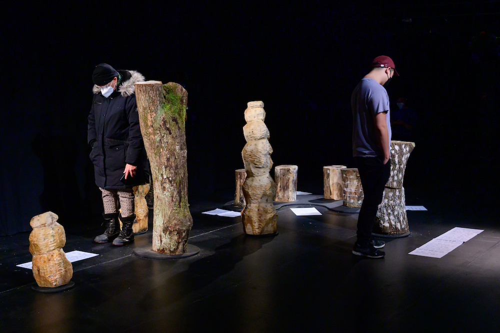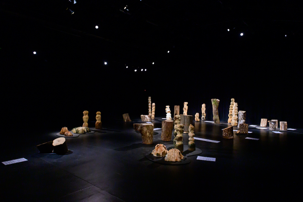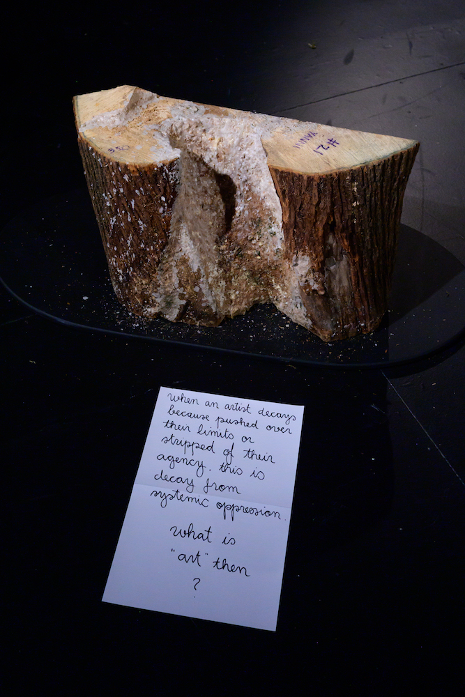 the installation stages carefully carved decaying tree stumps which had been seeded with species of bacteria and fungi during Fall 2021. Andrea, with the help of staff at Rhubarb bio-controlled the growth of these organisms while witnessing agency from native species which started to grow on the stumps as well. when commenting on the installation, Andrea spoke about her interest in how regeneration from decay.