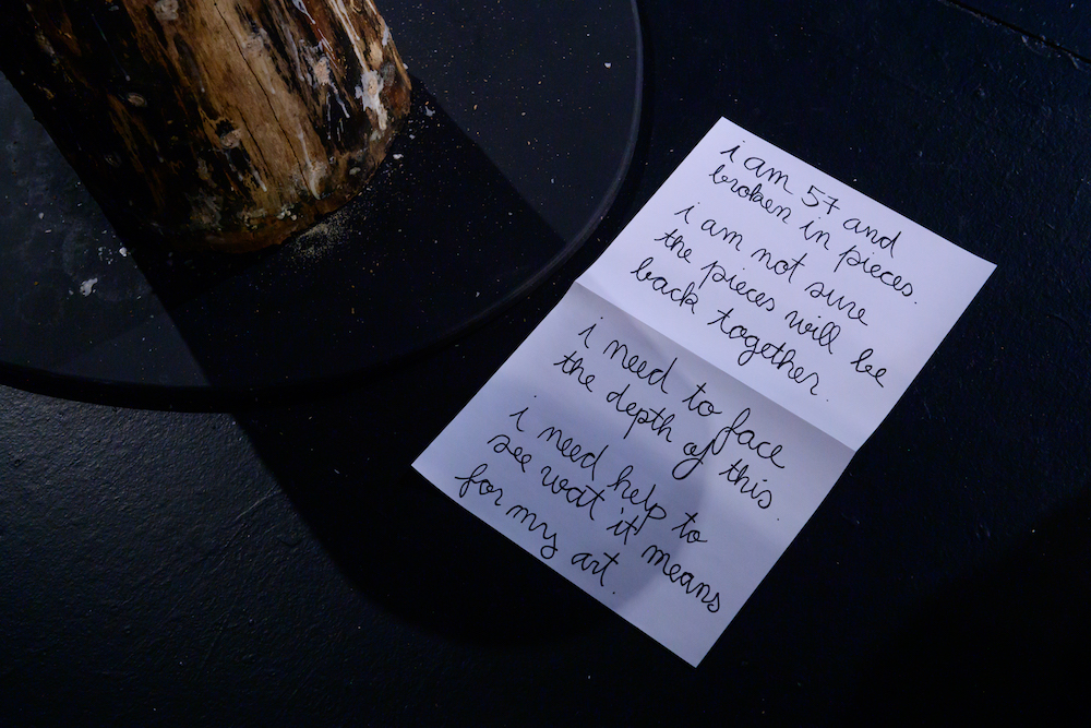 the installation stages carefully carved decaying tree stumps which had been seeded with species of bacteria and fungi during Fall 2021. Andrea, with the help of staff at Rhubarb bio-controlled the growth of these organisms while witnessing agency from native species which started to grow on the stumps as well. when commenting on the installation, Andrea spoke about her interest in how regeneration from decay.